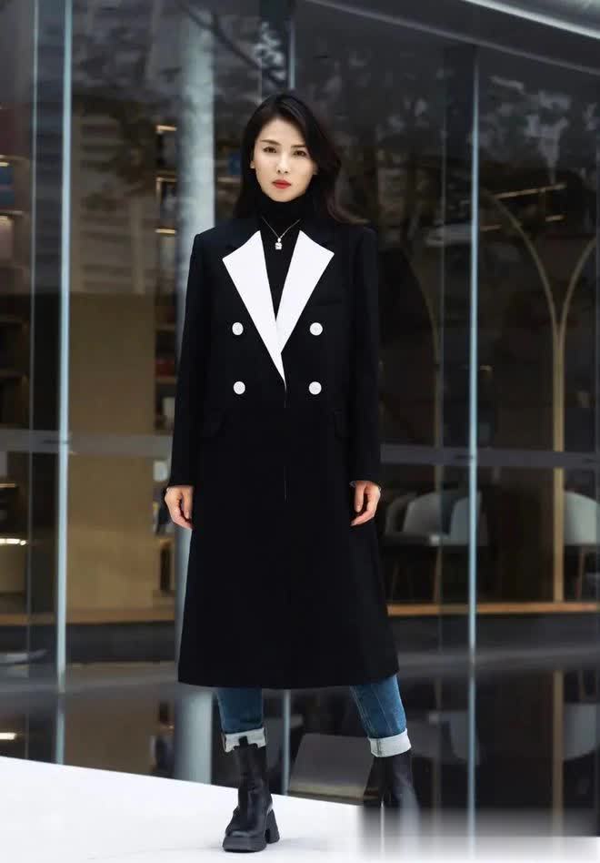 倘若已对基础款黑色大衣习以为常,不妨尝试黑白拼色设计。内搭黑色高领打底衫,佩戴精致项链,优雅拉长脖颈线条。这种大胆尝试打破了单调,增添时尚层次感,为冬日穿搭注入新活力。