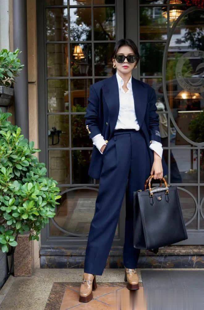 藏蓝色西装套装相较传统黑色西装,更具个性与时尚感。内搭白色衬衫,搭配黑色公文包与墨镜,既维持了常规职业形象,又增添了独特气场。