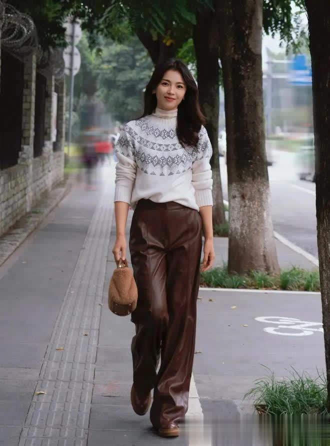 一件白色毛衣搭配棕色皮裤与同色系棕色鞋子,营造出视觉上的高挑效果。将毛衣前摆巧妙塞进裤子,既强调了腰线,又增添了几分时尚感。这般穿搭,优雅与时髦兼具,完美展现个人风格与身材优势。